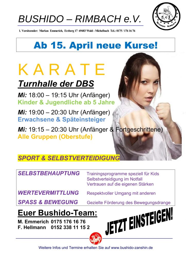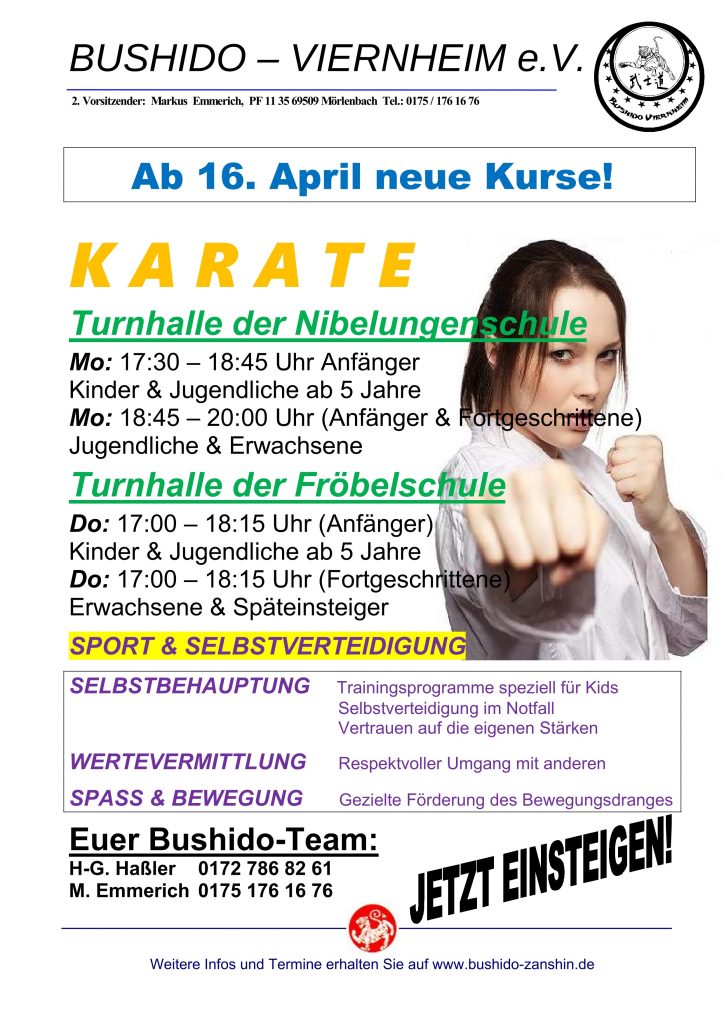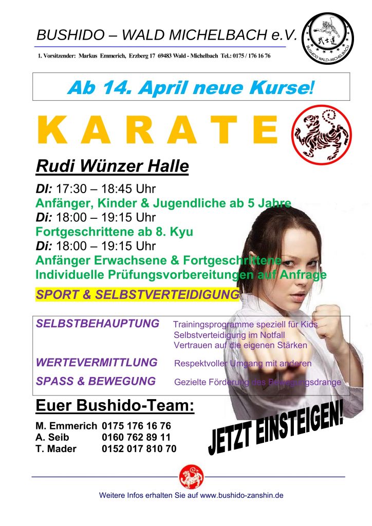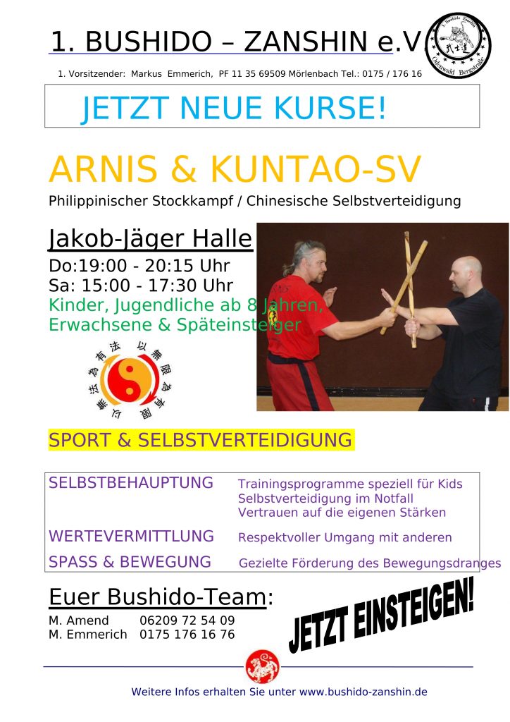 Liebe Bushido-Mitglieder, liebe Neueinsteiger, ab 02. September beginnen wieder neue Einsteigerkurse euer Bushido-Team